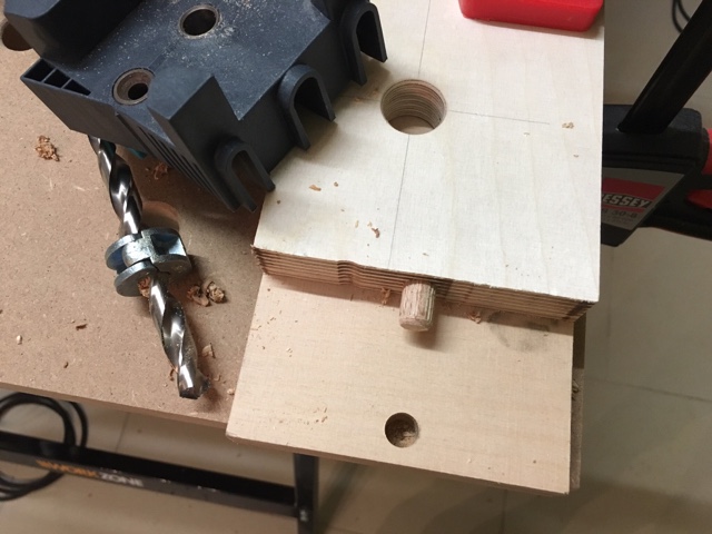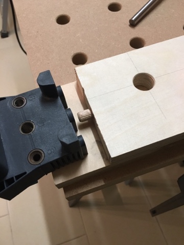 Darum habe ich mich dazu entschieden, nur ein 10er Dübel mittig zu setzen und die Ecken zusätzlich zu verschrauben. Ich denke das gibt ausreichend Stabilität, auch wenn es keine verdeckte Verbindung mehr ist.