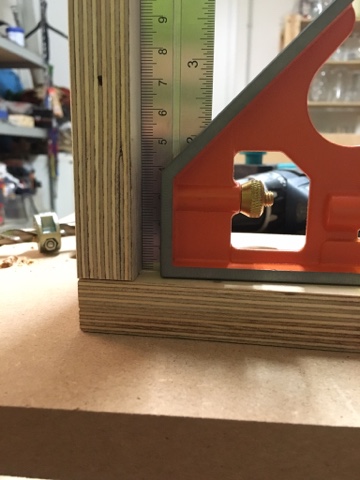 Zuerst stand die Frage der Rahmenverbindung im Raum. Eigentlich hätte mir eine Gehrungsverbindung besser gefallen, aber da ich noch keine Flachdübelfräse besitze habe ich mich für die stumpfe Variante entschieden.