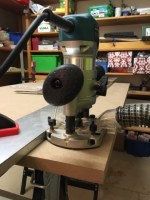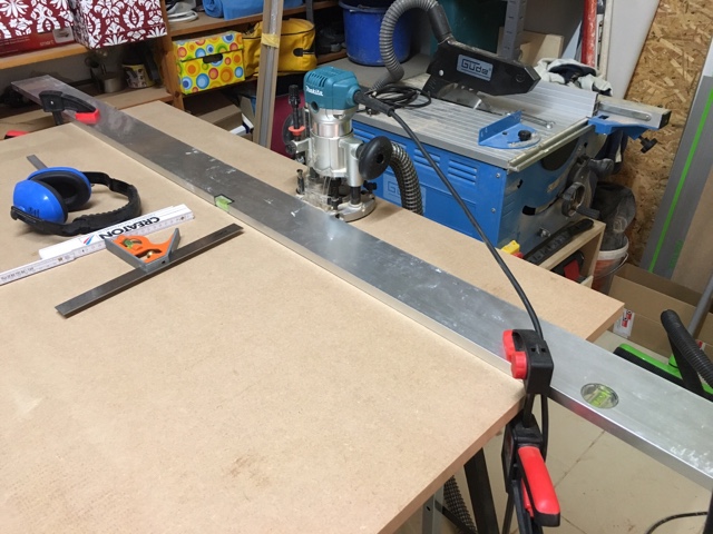 Als nächstes ging es mit der Werkplatte weiter. Als erstes habe ich die Nut für die Aluprofilschiene gefräst. Dazu habe ich mir einen 17mm Nutfräser für 5 EUR bestellt (nachdem ich bei Andi gelesen haben, dass er diesen auch verwendet und offensichtlich recht brauchbare Ergebnisse erzielt hat).