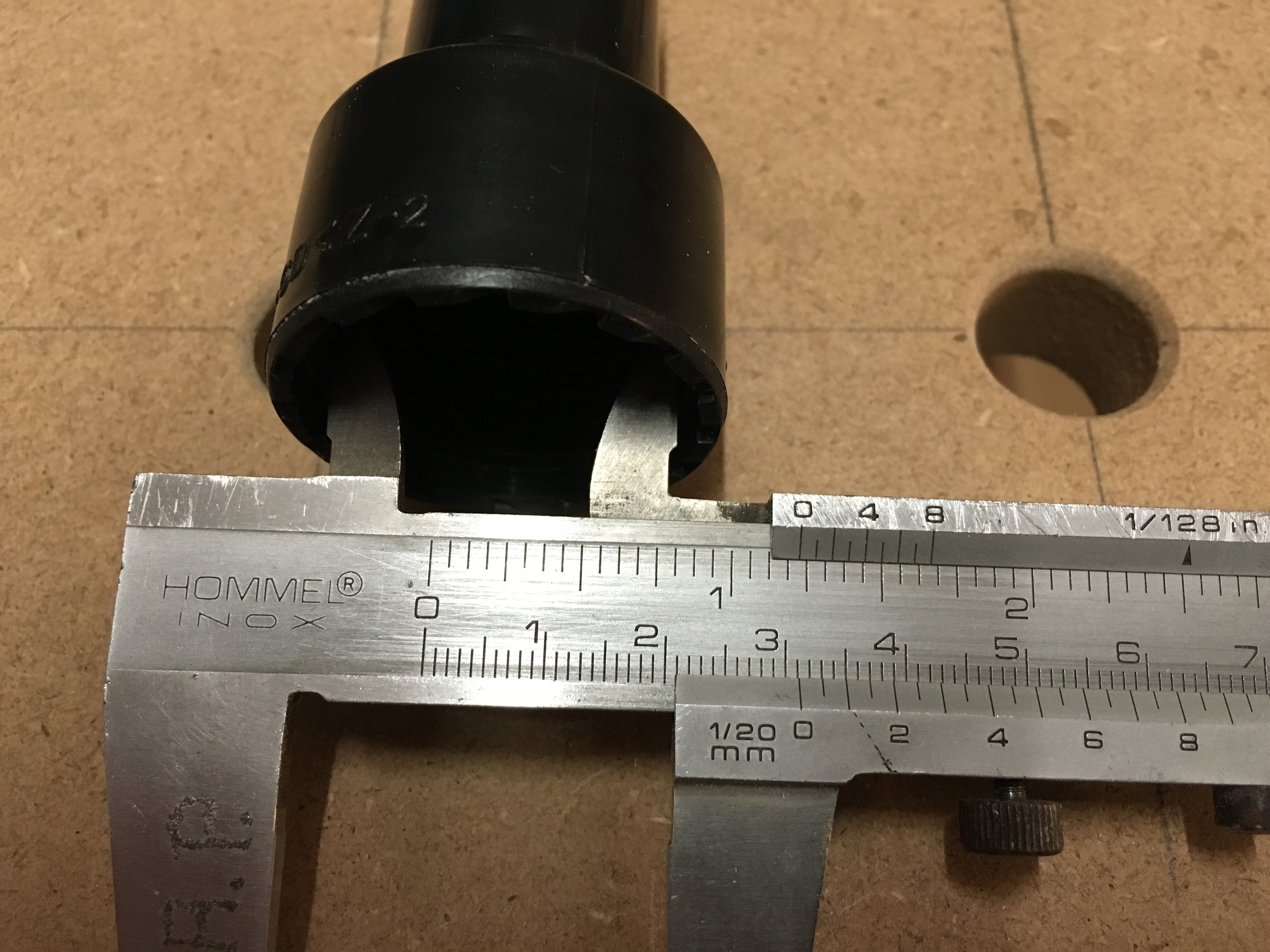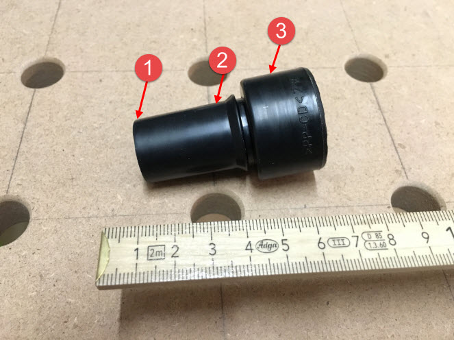 Im Folgenden findet Ihr die Abmessungen des Adapters, der im vorderen Bereich konisch zu läuft und dadurch sehr straff an der Maschine sitzt.