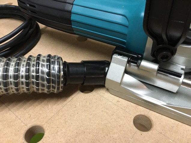 Heute wurde meine Makita Flachdübelfräse PJ7000J geliefert und mit ihr ein Makita Adapter für den Anschluss an einen Staubsauger. Ich habe mich gleich dazu entschlossen den Adapter mit zu kaufen und die FDF mit Sauger zu betreiben anstatt des mitgelieferten Staubbeutels.