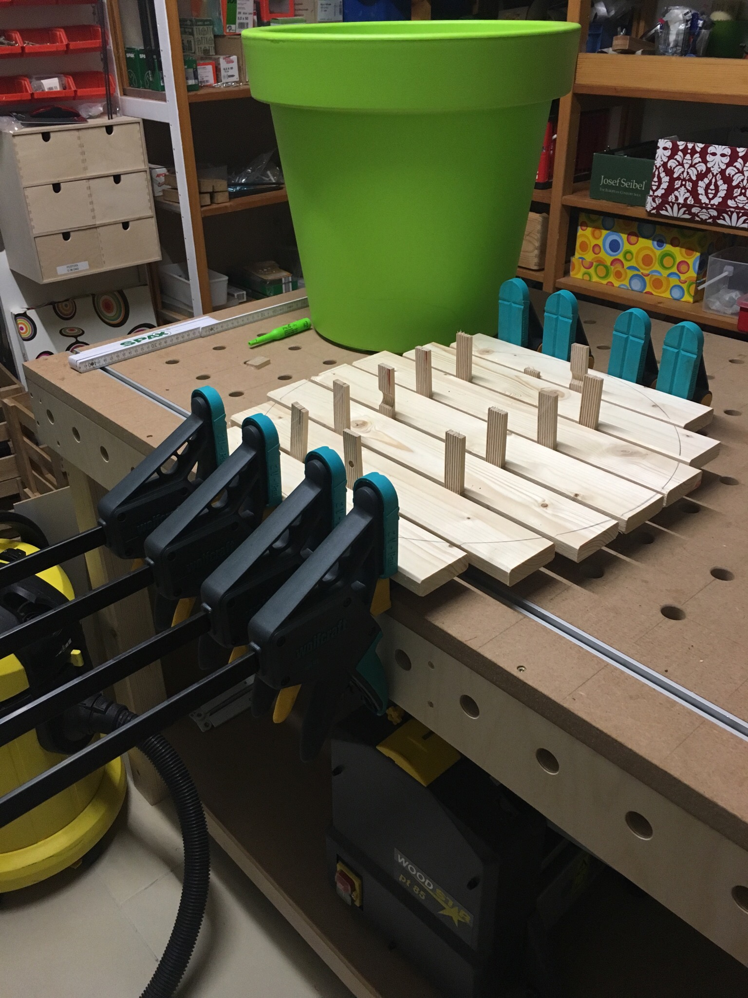 Um die äußerste Lage der Querstreben zu ermitteln, musste der innere Rand des Blumenkübel ermittelt werden…also anzeichnen, messen und zuschneiden der Querstreben.
