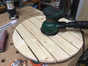 Die gesägten Kanten habe ich mit einem Fasenfräser und die Fläche mit dem Exzenterschleifer bearbeitet. Für die Stirnseiten musste wieder mal der Handschleifklotz herhalten.