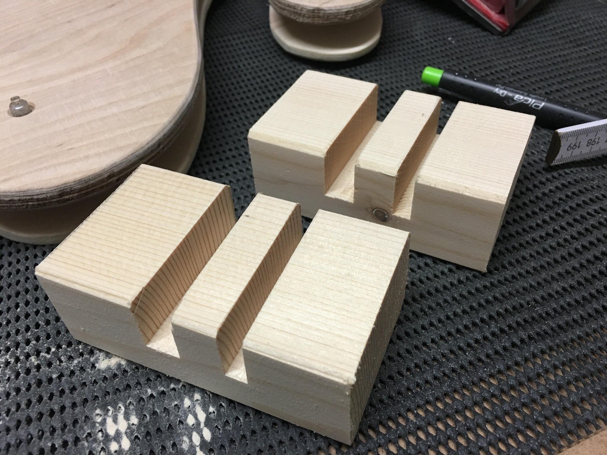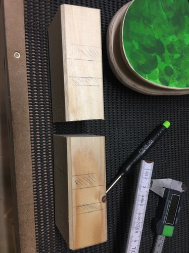 Für die Stützfüße hatte ich noch ein Stück Kantholz übrig. Also zwei Stücke abgeschnitten und die Lage der Nuten eingezeichnet