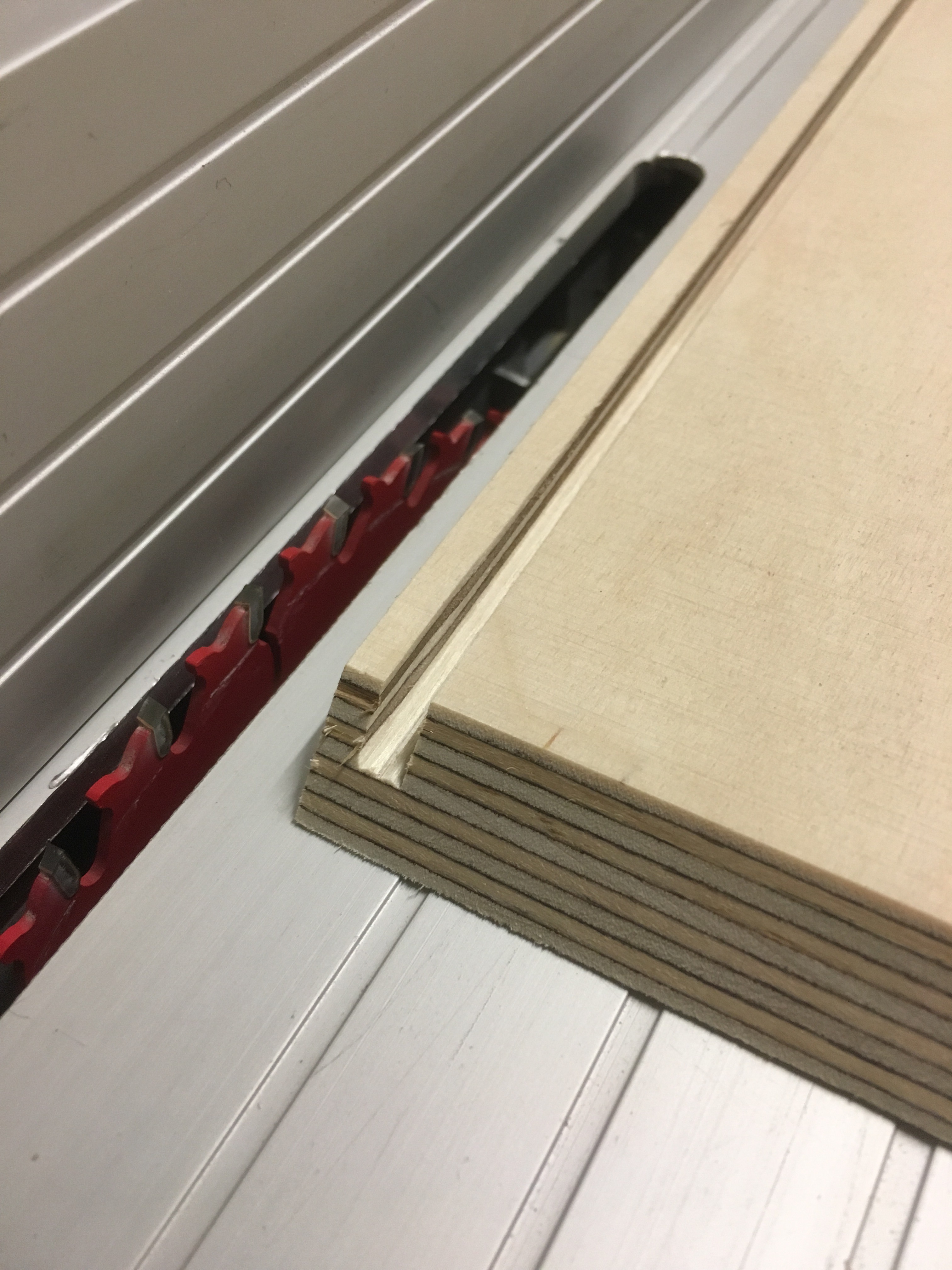 Die Nut für die Bodenplatte habe ich auf der TKS geschnitten. Zwei Durchgänge waren auf Grund der Dicke der Bodenplatte notwendig.