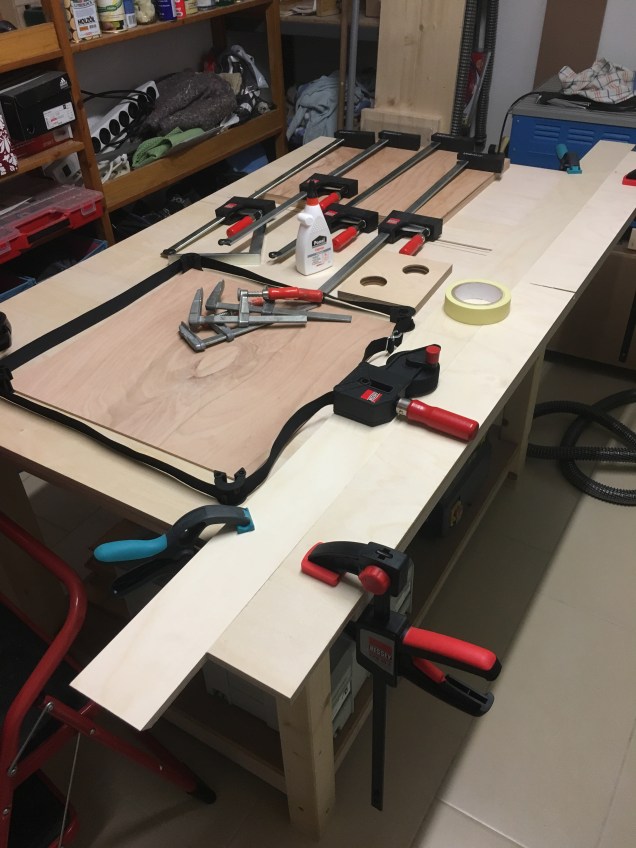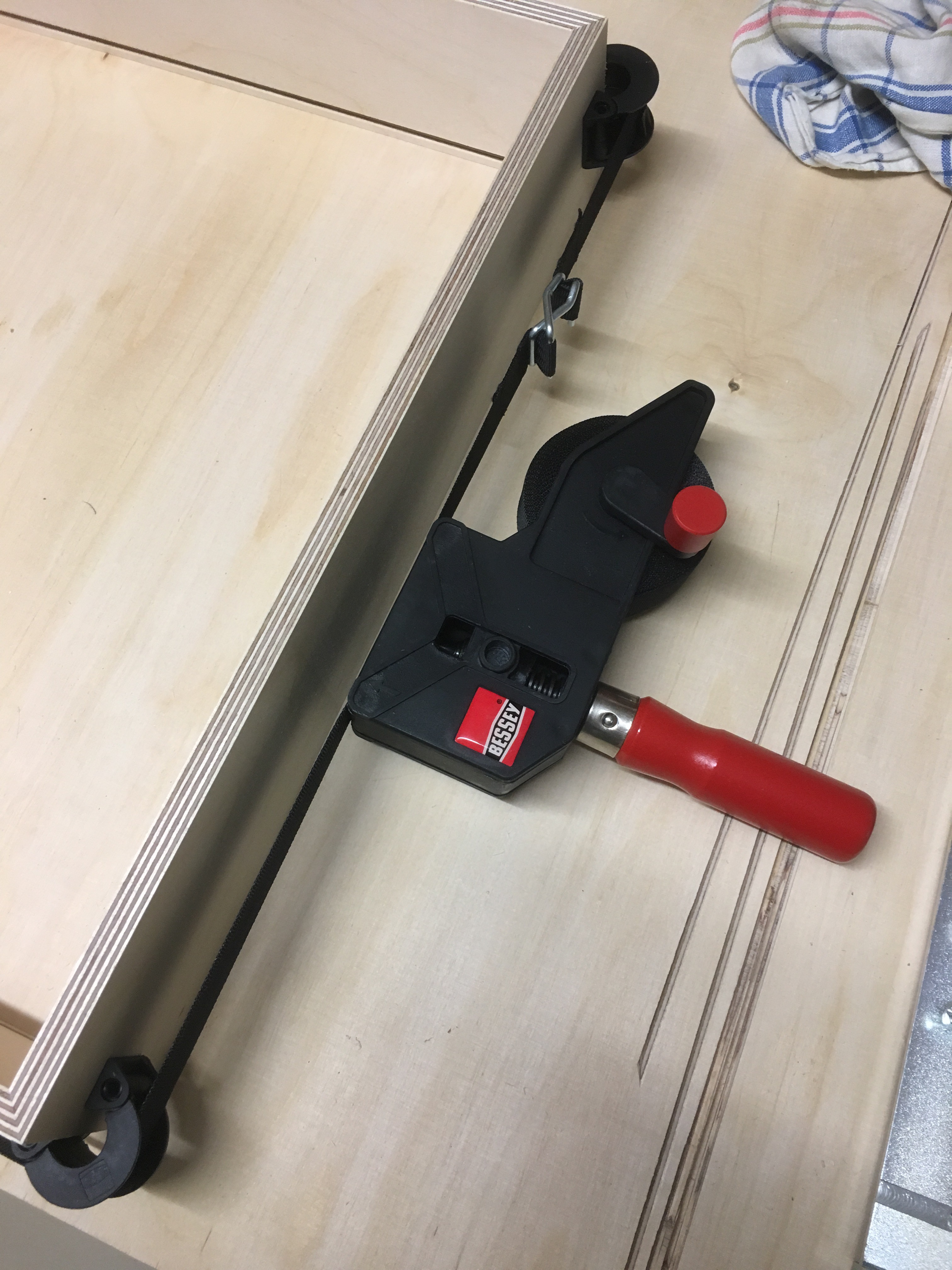Eigentlich wollte ich mit den DuoKlamps  arbeiten, habe aber schlussendlich doch den Bandspanner von Bessey benutzt. Ich kam mit der Verwendung der Zwingen und der Gehrungsverbindung nicht so gut zu recht.