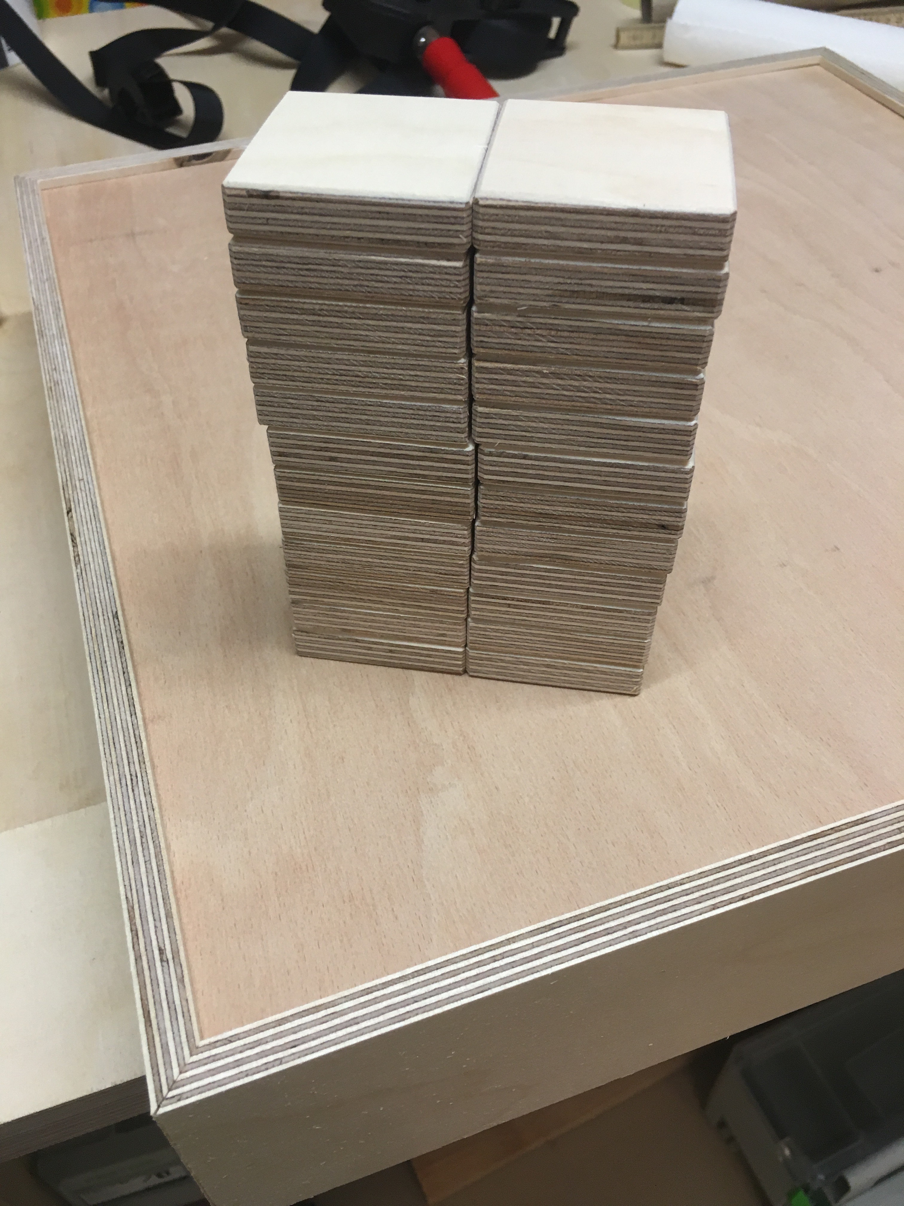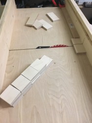 Als nächstes habe ich die Klötzchen zugeschnitten und geschliffen. Beim Zuschnitt konnte ich zum ersten Mal die Vorzüge meines Sägeschlittens (Cross-Cut Sled) genießen.