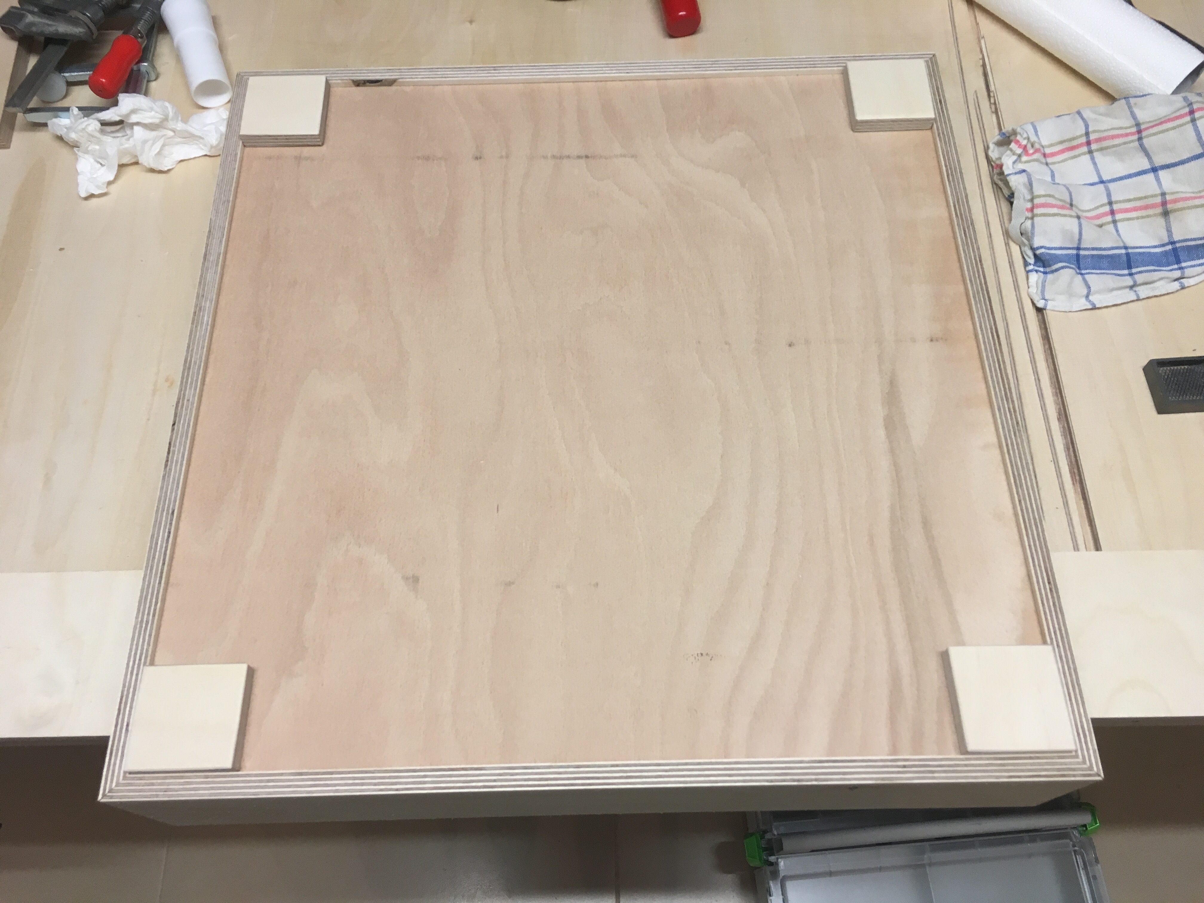 Die Kisten sind in den Ecken auf Gehrung gestoßen und die Bodenplatte ist eingenutet. Damit sie gestapelt werden können, habe ich in den Ecken jeweils Klötzchen angebracht, die einerseits die Kisten beim Stapeln gegen verrutschen fixieren und andererseits als Auflage dienen, wenn die Kisten auf dem Boden stehen…zusätzlich mit Filzgleitern versehen 🙂