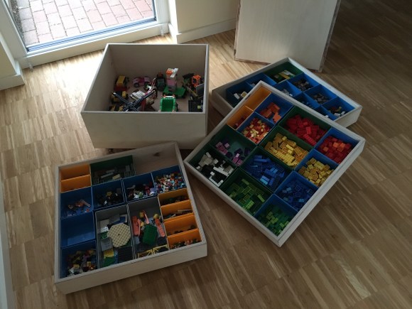 In Summe habe ich 6 Kisten geplant. 4 Kisten für die Aufbewahrung der Legosteine und 2 Kisten, damit die fertigen Objekte auch einen Platz haben. Diese beiden Kisten sind höher als die Kisten für die Legosteine.