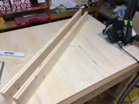 …und so hatte ich die Idee eine Leiste in der Führungsschiene und eine weitere Leiste seitlich am Sägetisch vorbei zu führen, damit sich der Schlitten beim Schieben nicht verkantet. Für die Führungsschiene habe ich eine Bucheleiste mit dem Woodster ADH auf das entsprechende Maß gehobelt. Wie sich später beim Bau herausgestellt hat, hätte ich die Leiste gleich etwas flacher hobeln sollen…so musste ich die Leiste später mit dem Handhobel bearbeiten.