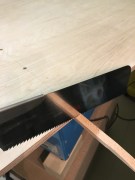 Als nächstes wurde die Platte eingeschnitten, indem ich das Sägeblatt langsam nach oben gedreht und so einen Schlitz in die Platte gesägt habe (auf keinen Fall die Platte komplett durchsägen!). Um den Schlitz herzustellen muss der Spaltkeil und die Spanschutzhaube abmontiert werden. Leider habe ich hiervon keine Bilder gemacht, da ich halt nur zwei Hände habe 😉