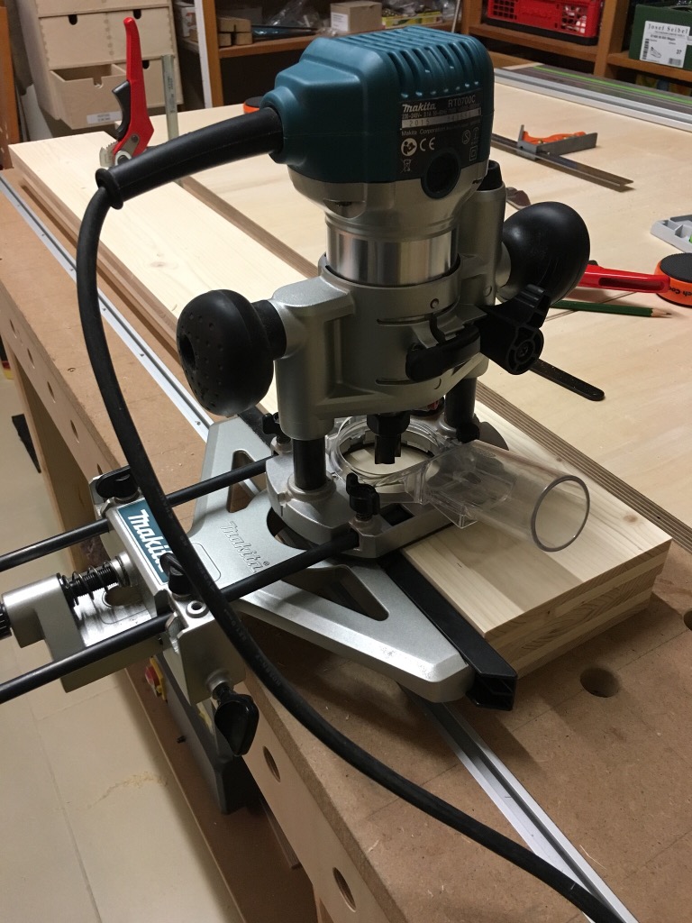 Das vordere Brett ist etwas höher, da ich hier noch eine T-Nutschiene eingefräst habe, für einen späteren Anschlag. Alle Kanten wurden anschließend noch mit einem 3 mm Abrundfräser bearbeitet.