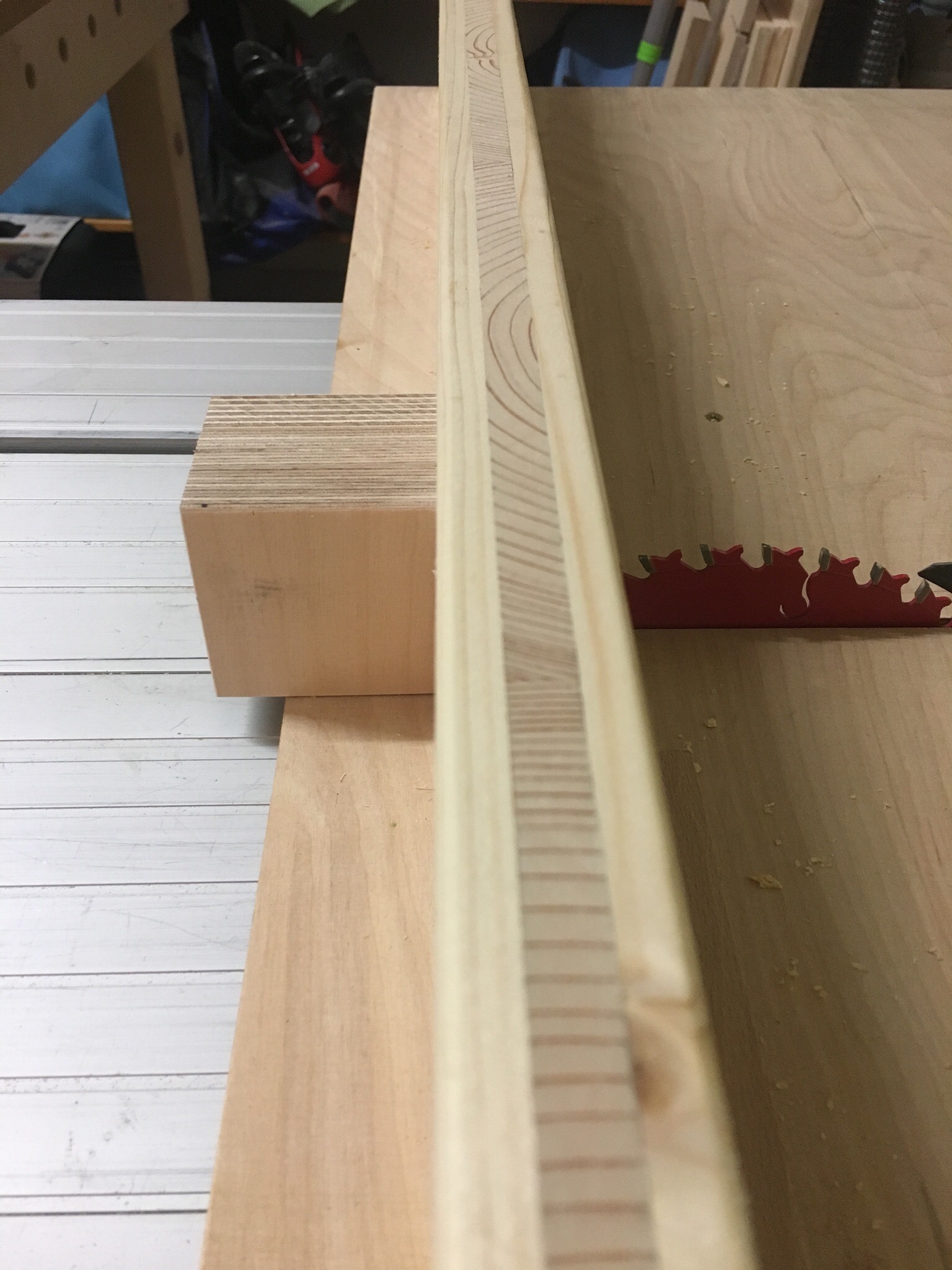 Mit dieser Einstellung folgten ein paar Probeschnitte. Um eine exakte Einstellung zu bekommen empfiehlt sich die 5-Schnitt Methode. Sobald alles gepasst hat, konnte auch der vordere Anschlag verschraubt und das Brett komplett durchgesägt werden.