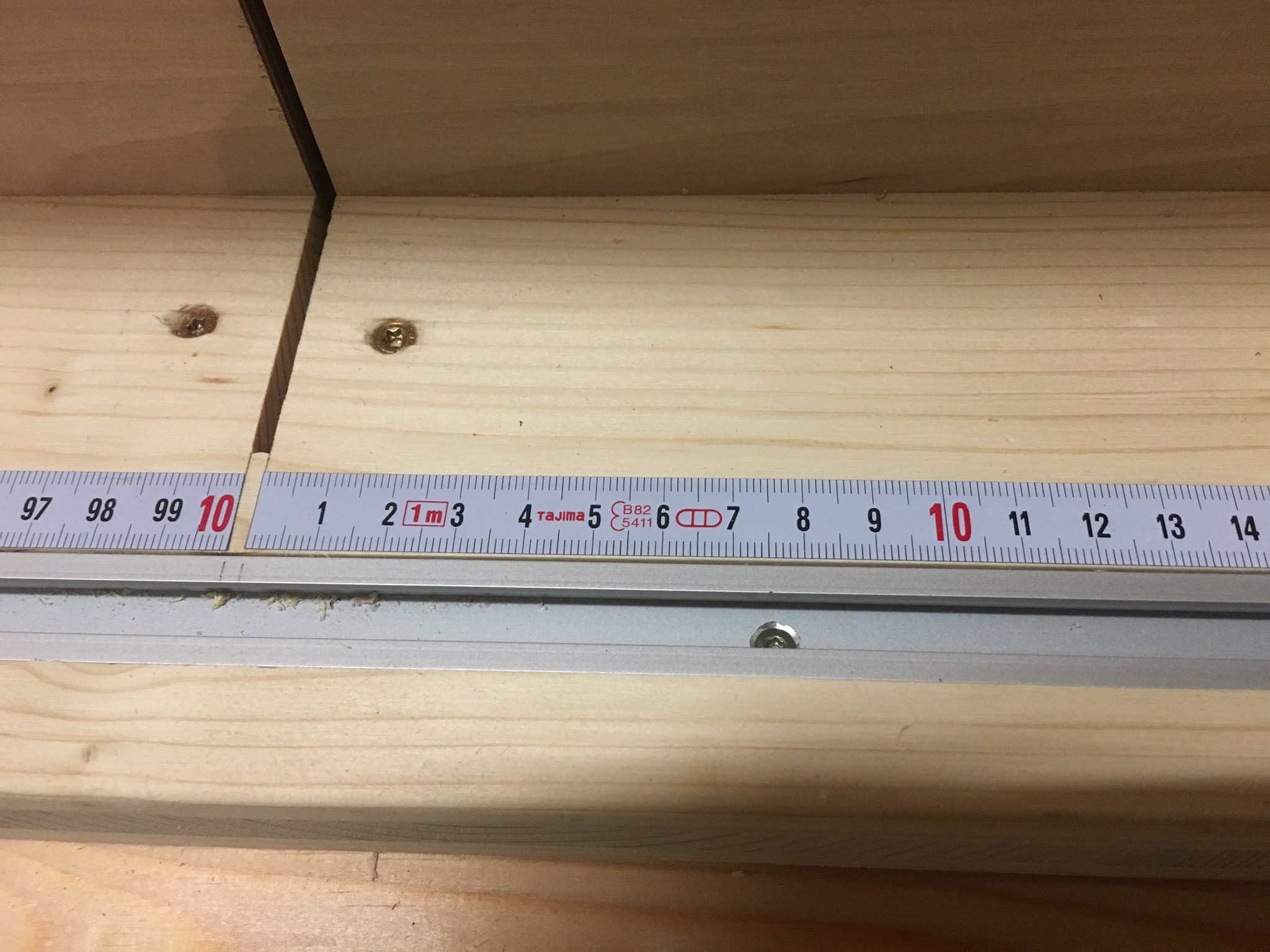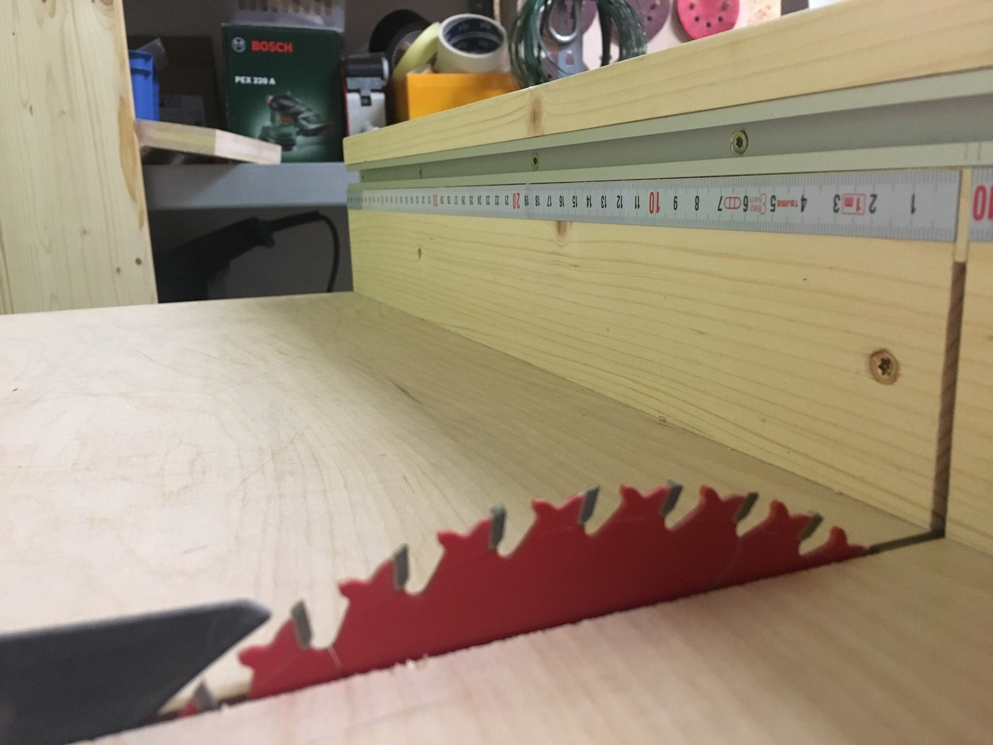 Um nicht jedes Längenmaß mit dem Meterstab einzustellen, habe ich mir ein selbstklebendes Maßband bestellt und im entsprechenden Abstand zum Sägeblatt aufgeklebt.